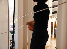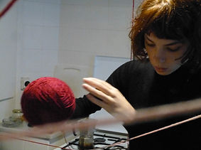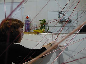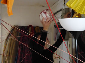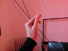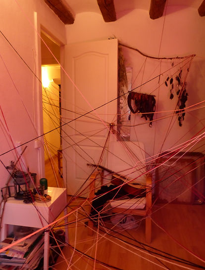 Dans cette performance, j’ai illustré ce qui nous arrive lorsqu’on rumine des pensées, lorsqu’on cogite sans fin sur une idée et qu’elle se mêle petit à petit à nos gestes et déplacements quotidiens. Le fil représente l’idée qui m’accompagne et qui m’entrave dans mes actions.